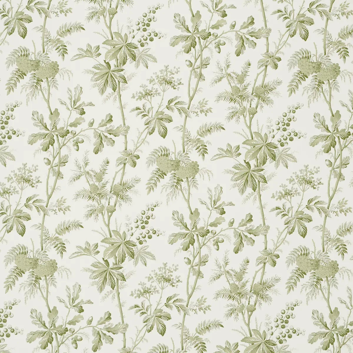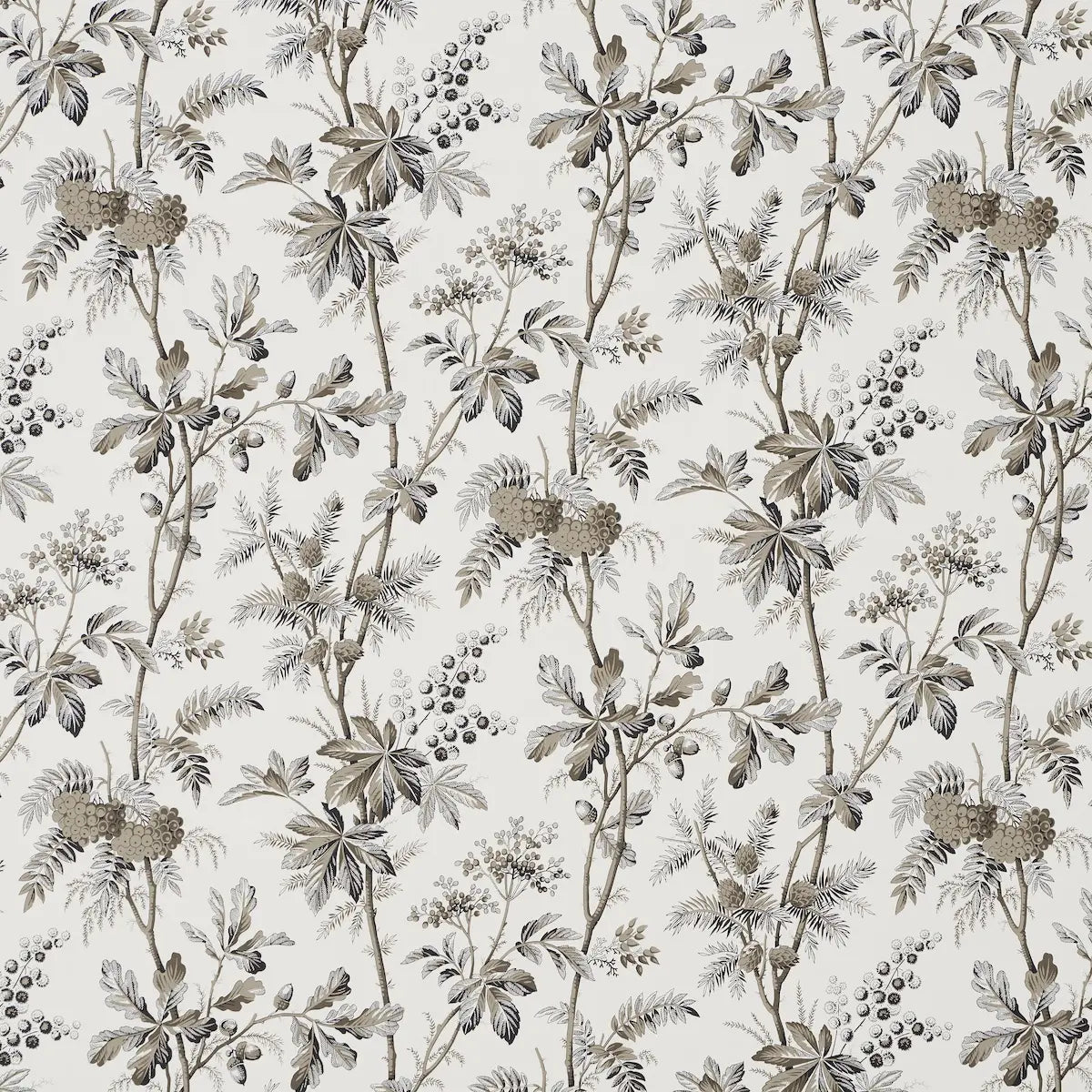 Featuring a gorgeous tangle of leafy branches, acorns, pine cones, and berries, Brantwood Vine is a handsome woodsy design with the crisp details and stylized look of a botanical illustration. Beautifully printed on a matte ground, this elegant medium-scale wallpaper works in any type of room and plays well with other patterns. Also available as a fabric.