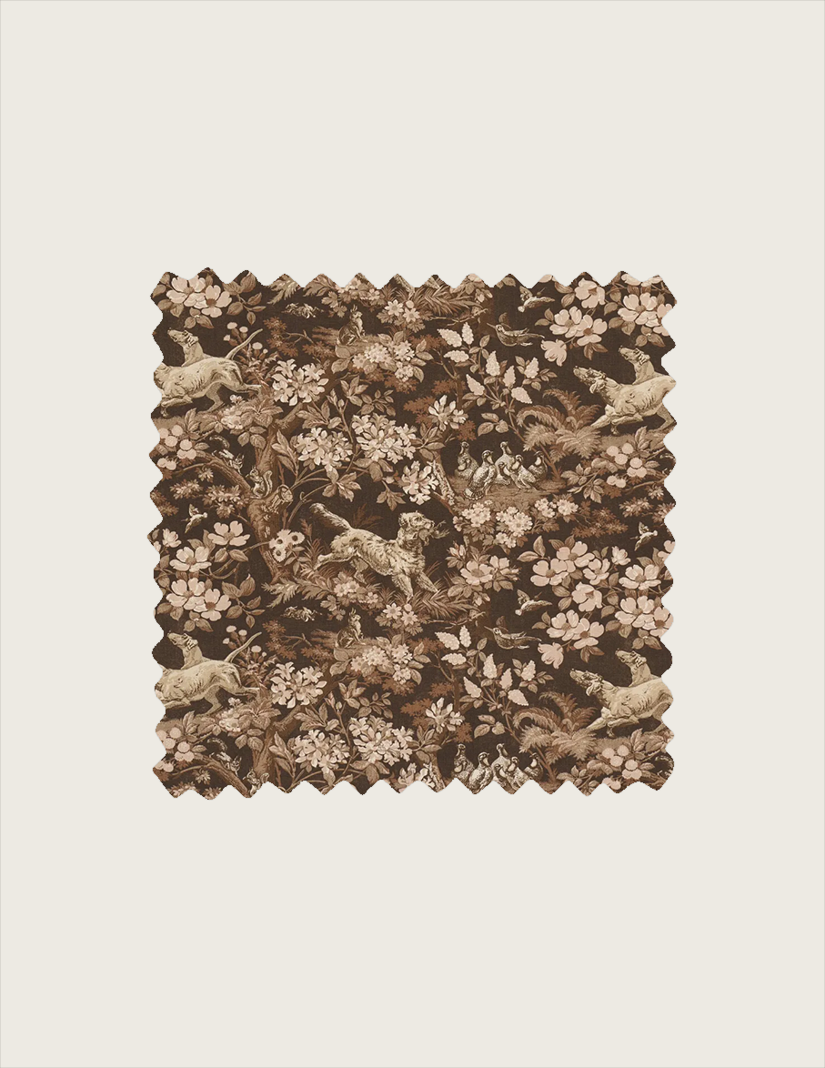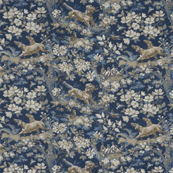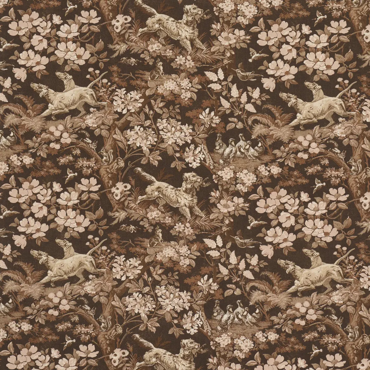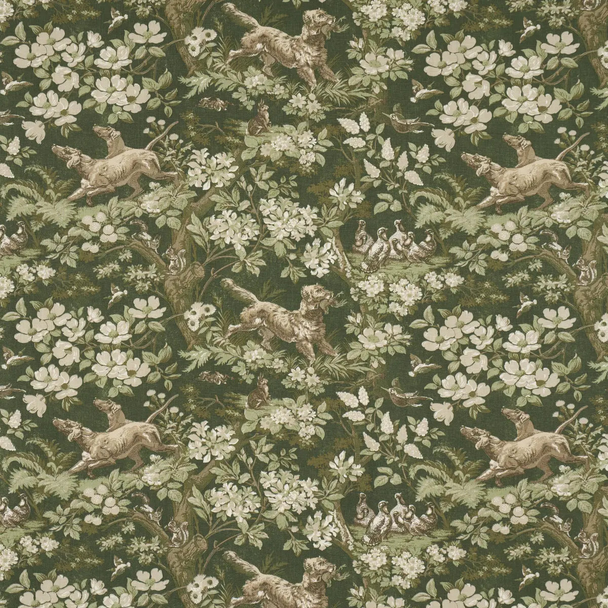 With its delicate linework and carefully drawn hunting dogs, birds, and other animals hiding among the foliage, this beautiful and highly detailed forest scene has a romantic, vintage feel. Printed on a fine 100% linen ground, Hound Meadow is a multipurpose medium-scale botanical suitable for everything from window treatments to wall upholstery.