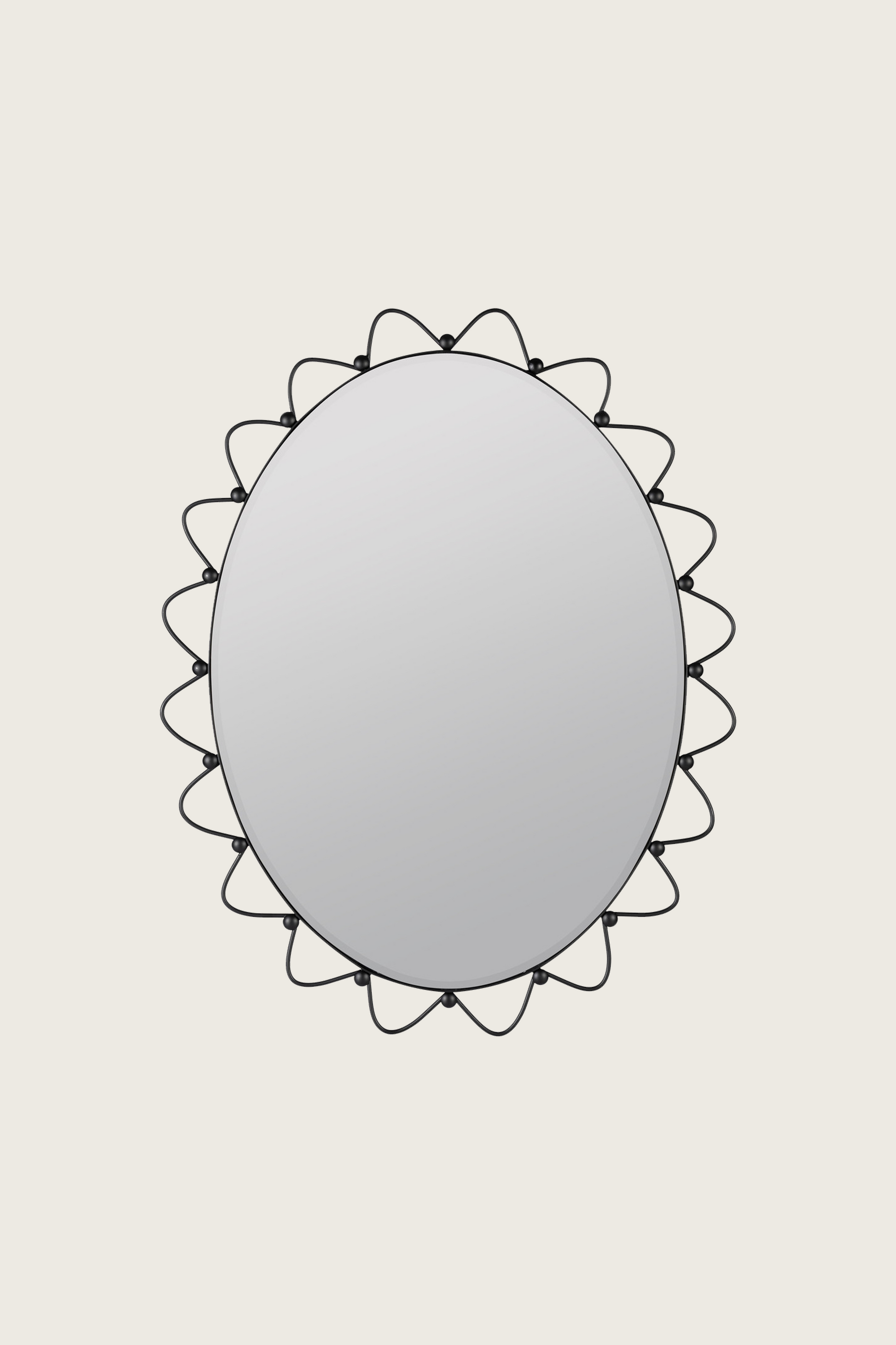 Sculptural and expressive, the Iris Mirror transforms a classic oval silhouette into a striking focal point. A delicate looping metal surround radiates outward like petals, creating a rhythmic, almost floral frame that adds movement and dimension to the wall. The contrast between the smooth mirrored surface and the graphic metal detailing gives Iris a refined yet playful presence. Perfect for entryways, powder rooms, or layered gallery walls, this mirror brings artful character and a touch of whimsy to contemporary and eclectic interiors.