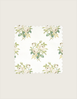 A romantic, painterly quality infuses this rose bouquet with an unmistakably feminine beauty. The blooms are wonderfully detailed yet the petals and leaves display a lovely looseness. Also a fabric.