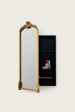 Elegant and quietly ornate, the Margot Medicine Cabinet elevates a functional essential into a refined design statement. Framed in a warm antiqued finish, its softly arched silhouette is accented with delicate sculptural detailing at the crown and base—an homage to classic European forms. The slim profile keeps the look light and architectural while discreetly concealing storage behind the mirror. Ideal for powder rooms and primary baths alike, Margot brings timeless charm, thoughtful craftsmanship, and polished presence to spaces where beauty and utility meet.