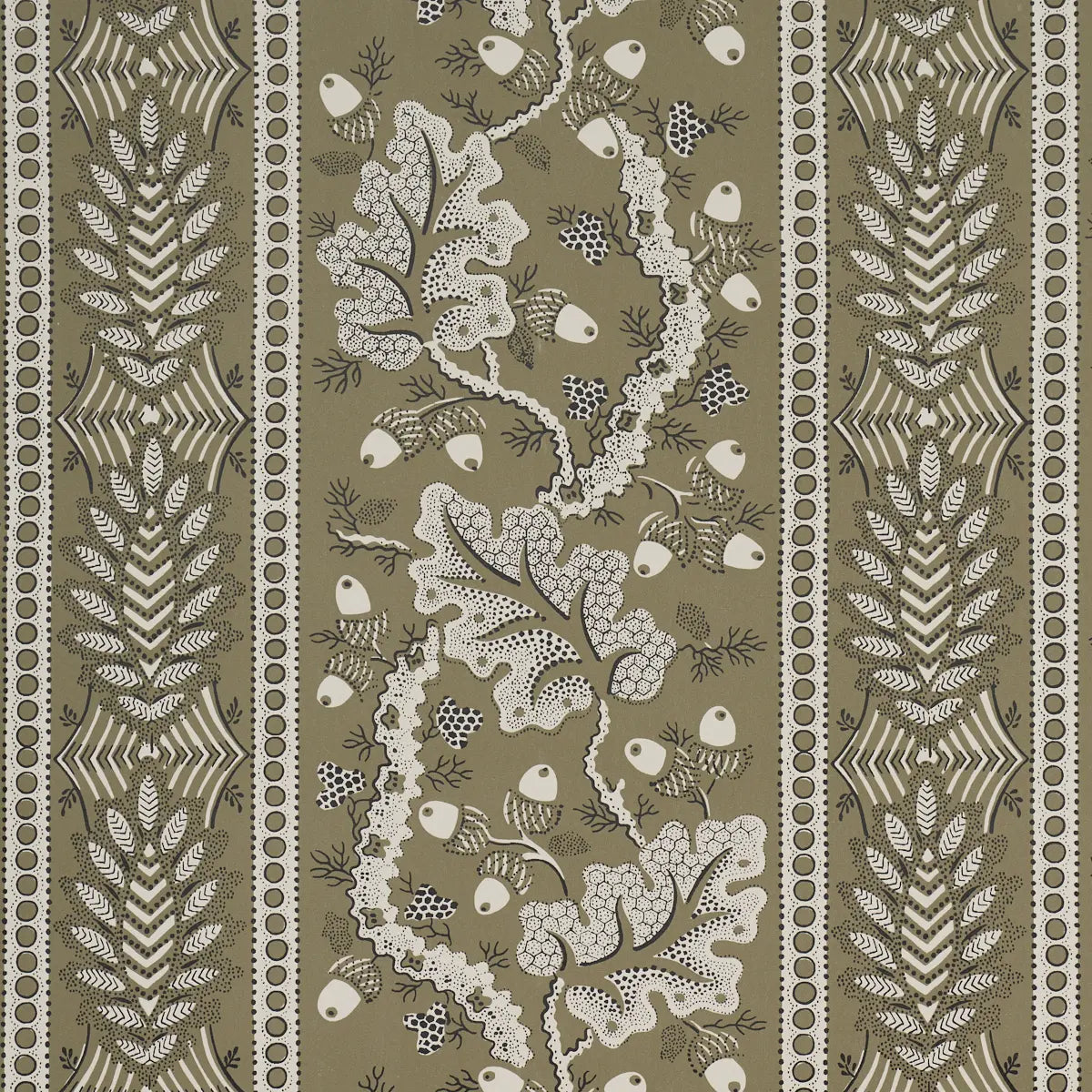 Inspired by a design in our archive and gravure-printed to capture the original’s exceptional detail, Richmond House is a handsome stripe enlivened by stylized acorns and oak leaves. Rich, rhythmic, and rooted in tradition, this wallpaper’s versatile medium-scale pattern bridges past and present.