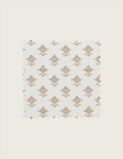Rubia Embroidery’s stylized flowers are rendered in an irregular running stitch with a subtle sheen. The ivory fabric’s linen ground has a gorgeous hand and understated elegance.