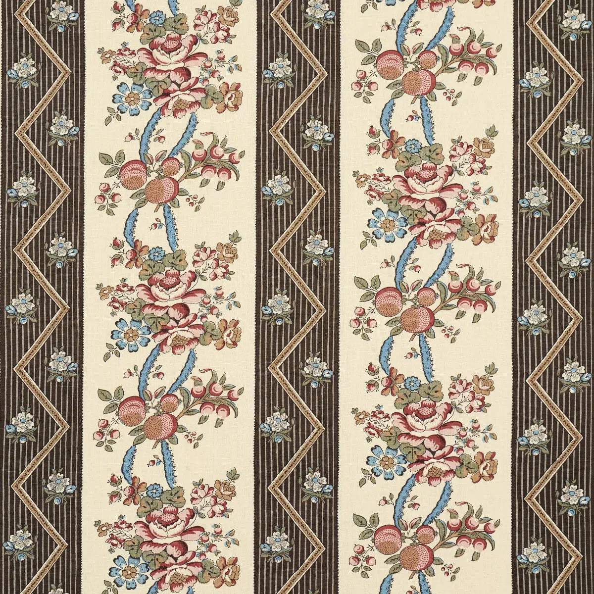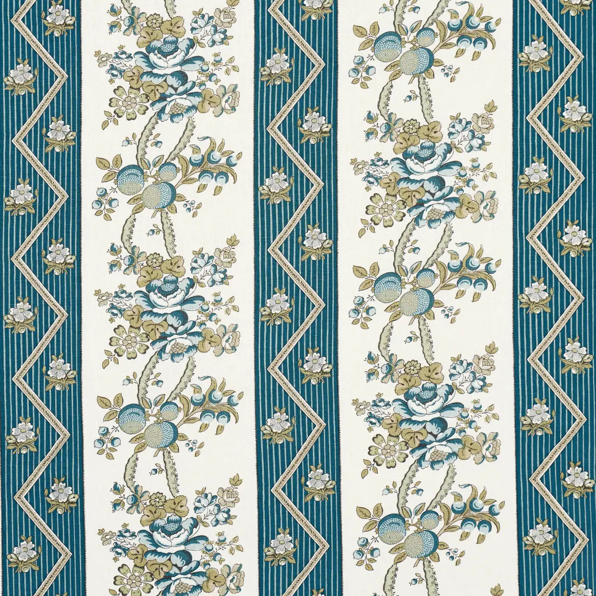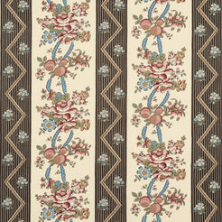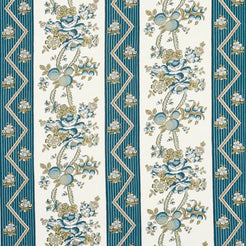 Inspired by a French hand-block print, this fantastic floral stripe is table printed on versatile, mid-weight linen. With its delicate botanical elements and unique zigzag details, this medium-scale fabric works beautifully for upholstered pieces and pillows, but it is especially lovely for curtain panels. Also available as a wallpaper.